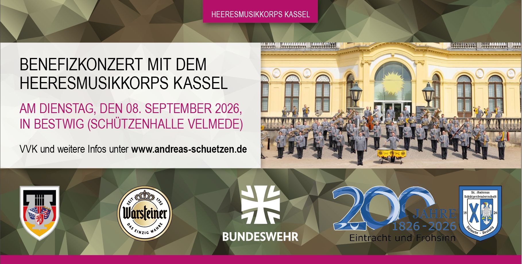 Ein musikalischer Höhepunkt im Jubiläumsjahr der Schützenbruderschaft Velmede-Bestwig steht bevor: Das Heeresmusikkorps Kassel gibt am 08. September 2026 ein Konzert in der Schützenhalle Bestwig‑Velmede. Das…